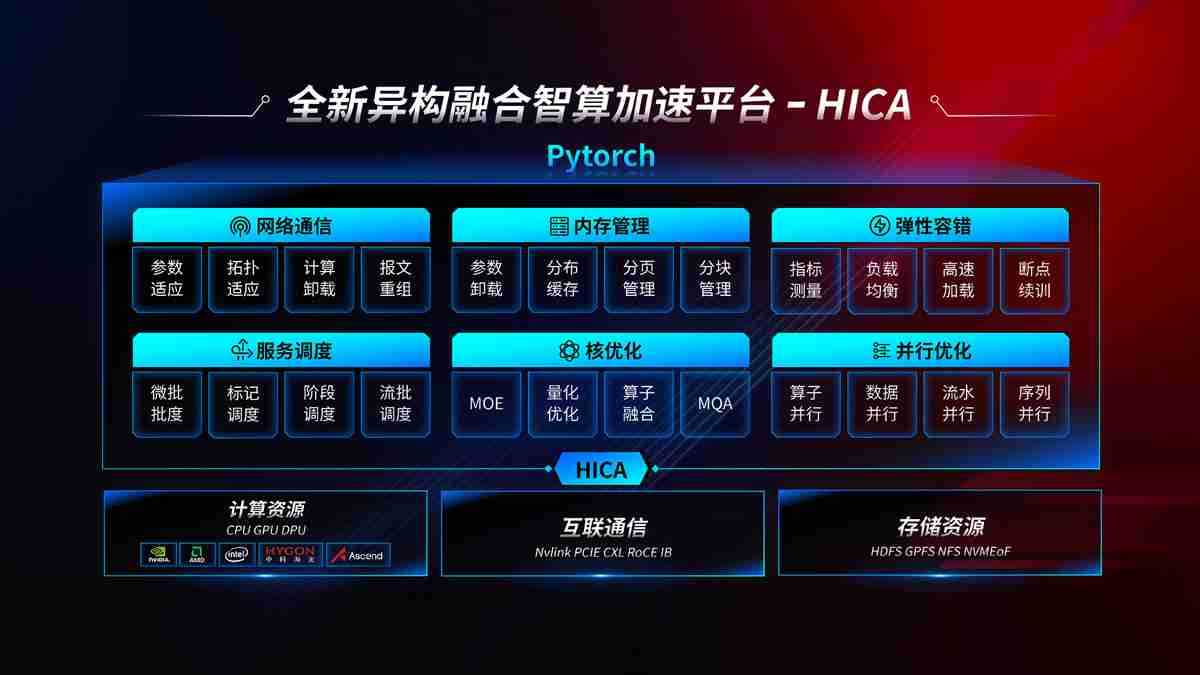 通过自研的服务层、、、中间适配层、、、、以及调度编排算法,,采用数据并行、、、、模型并行等多种并行方式,,,把并行计算任务进行有效的分解,,,,使其分别由相应的软件栈和算力资源来承接。。当GPU资源变化,,,,HICA可以实时动态调度计算子任务并调整模型拓扑和架构,,,,以充分聚合各种算力资源。。。