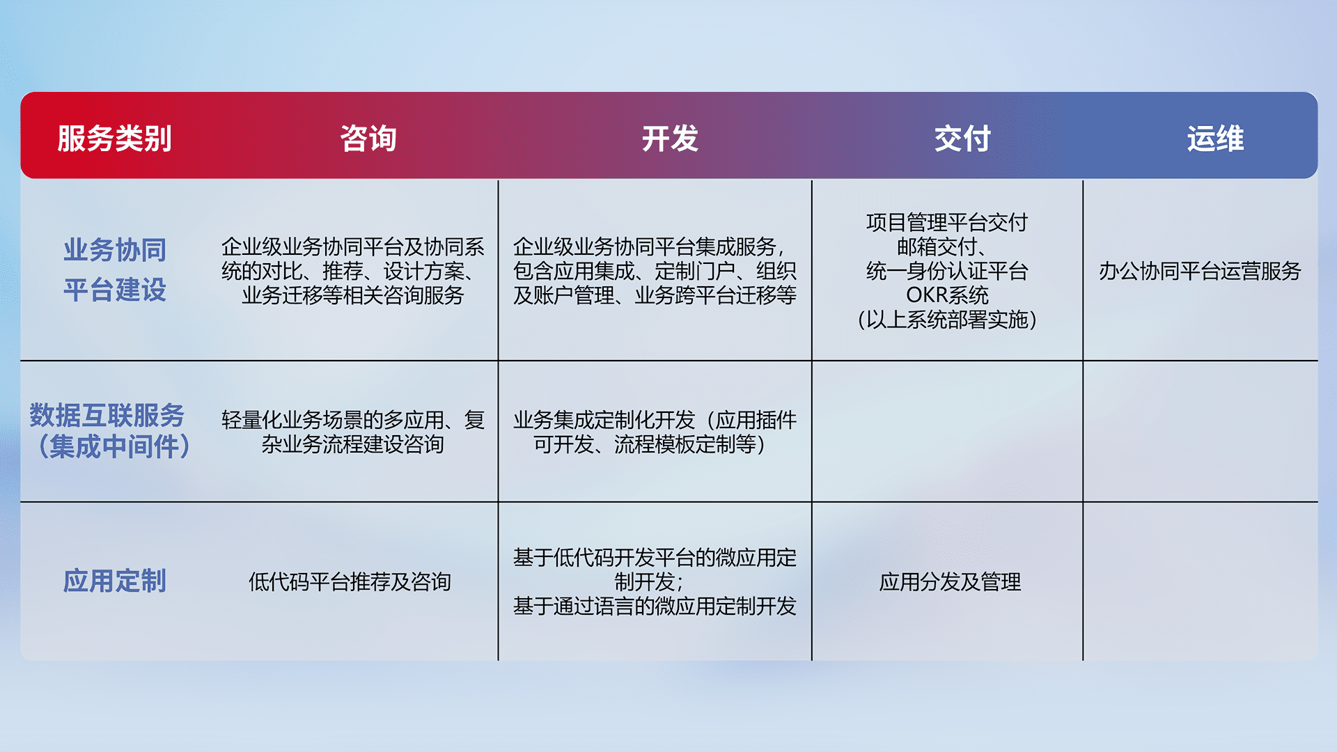 针对钉钉、、企微、、IDaas等平台级产品提供产品的规划、、、、方案、、、、交付、、、、定制化开发等服务,,,实现如统一协同办公、、、、智能客户服务、、混合会议管理、、、智能数据查询、、等业务场景,,,实现数字化转型。。。。